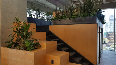 A través de un diseño innovador y ubicación de especies aptas para el espacio y de bajo mantenimiento, agregamos valor tanto a los usuarios como a los clientes. La instalación cuenta con piezas de metal y fibra de vidrio a la medida, utilizadas para adecuar a los espacios y poder trabajar en sintonía con los arquitectos, creando un espacio laboral moderno, comodo y elegante.